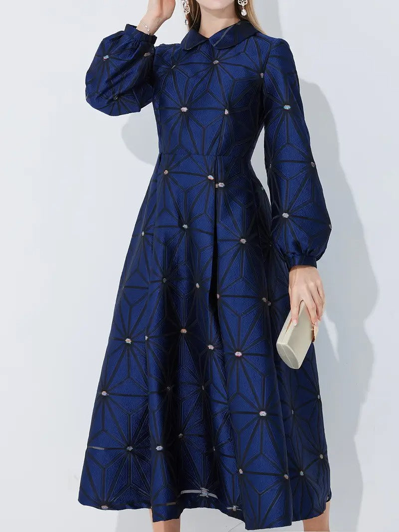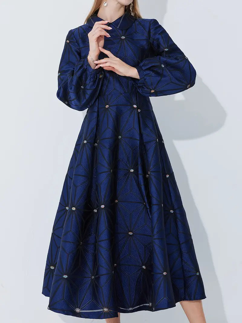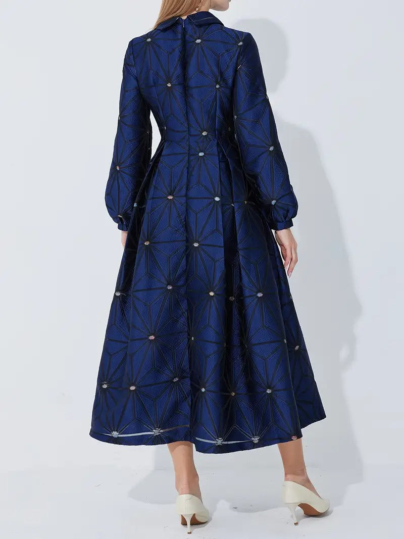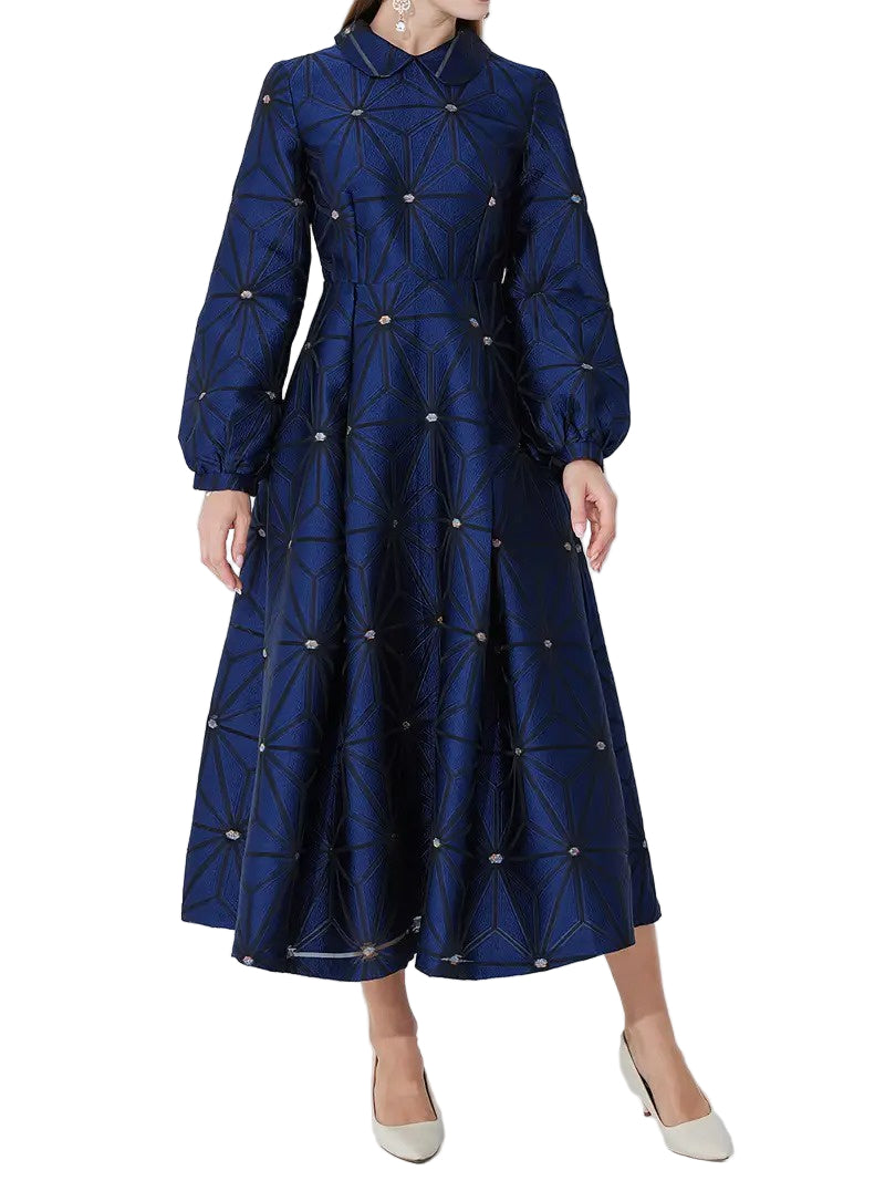 Ta damska sukienka midi ma długie rękawy z mankietami, które zbierają się przy nadgarstkach. Z przodu znajduje się dekolt z kołnierzykiem. Na powierzchni sukienki znajdują się geometryczne wzory. Małe dekoracyjne zdobienia rozmieszczone są po całej sukience.