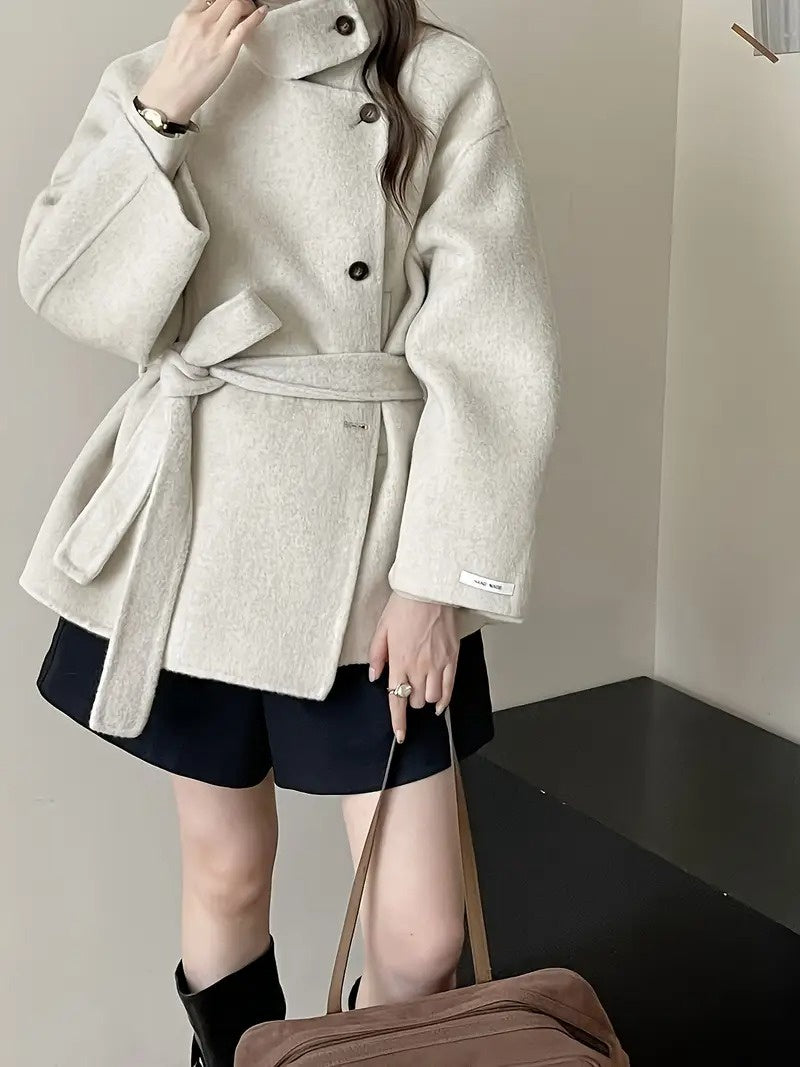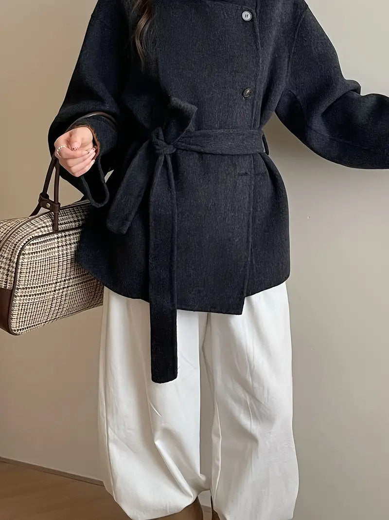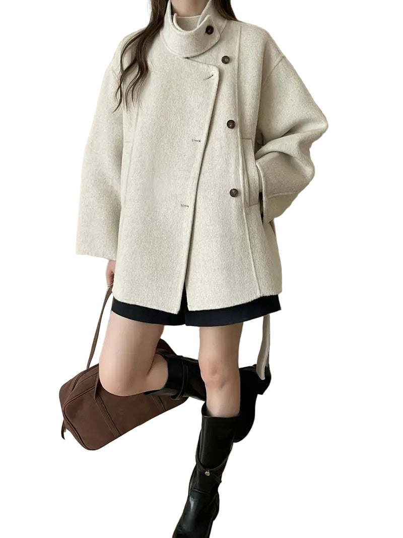 Ten damski płaszcz jest krótki i ma stojący kołnierz, który zapięty jest asymetrycznie na guzik przy szyi. Z przodu znajduje się pionowe zapięcie na guziki po jednej stronie. Płaszcz posiada kieszenie boczne. Do płaszcza dołączony jest pasek, który można zawiązać w kokardę w talii.
