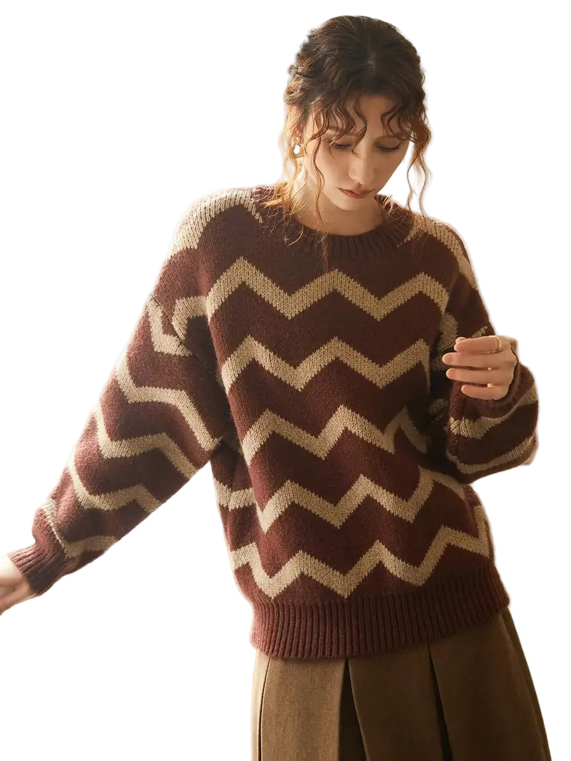 - Zygzaki: Wzór w zygzaki pokrywający zarówno korpus, jak i rękawy.