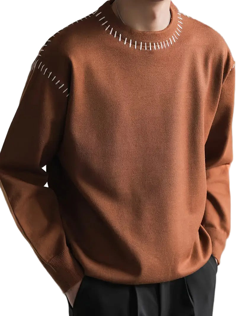 Ten męski sweter ma okrągły dekolt i długie rękawy. Końcówki rękawów oraz dolny brzeg swetra mają wzór prążkowany. Wzdłuż szwów ramion i dekoltu widoczne jest kontrastowe szycie.